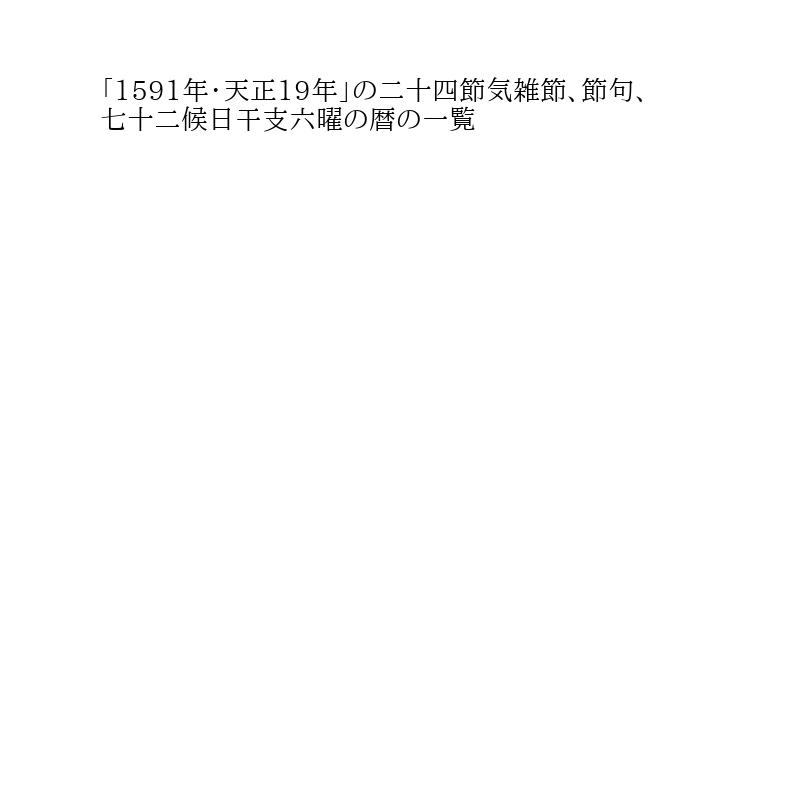 西暦「1591年・天正19年」の卯年(うさぎどし)辛卯しんぼう(かのとう)暦の一覧表です。二十四節気、雑節、節句の行事、七十二候、月干支、六曜と日干支、旧暦、祝日も出しています。年間のこよみカレンダーの一覧表です。
