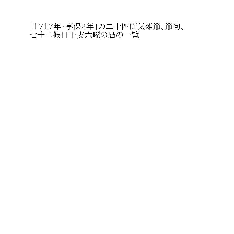 西暦「1717年・享保2年」の酉年(とりどし)丁酉ていゆう(ひのととり)暦の一覧表です。二十四節気、雑節、節句の行事、七十二候、月干支、六曜と日干支、旧暦、祝日も出しています。年間のこよみカレンダーの一覧表です。
