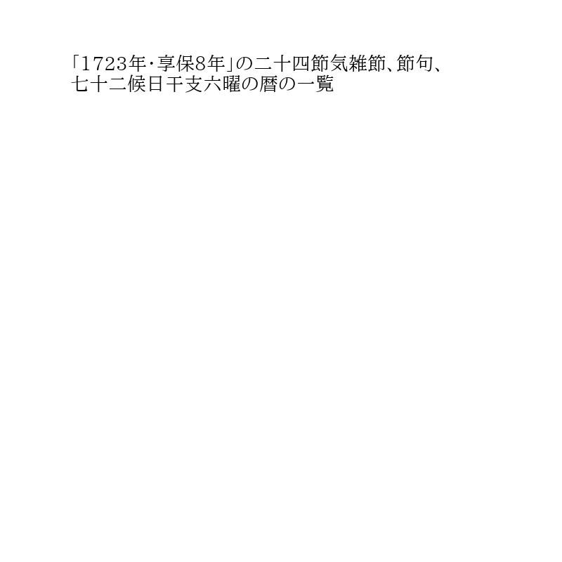西暦「1723年・享保8年」の卯年(うさぎどし)癸卯きぼう(みずのとう)暦の一覧表です。二十四節気、雑節、節句の行事、七十二候、月干支、六曜と日干支、旧暦、祝日も出しています。年間のこよみカレンダーの一覧表です。